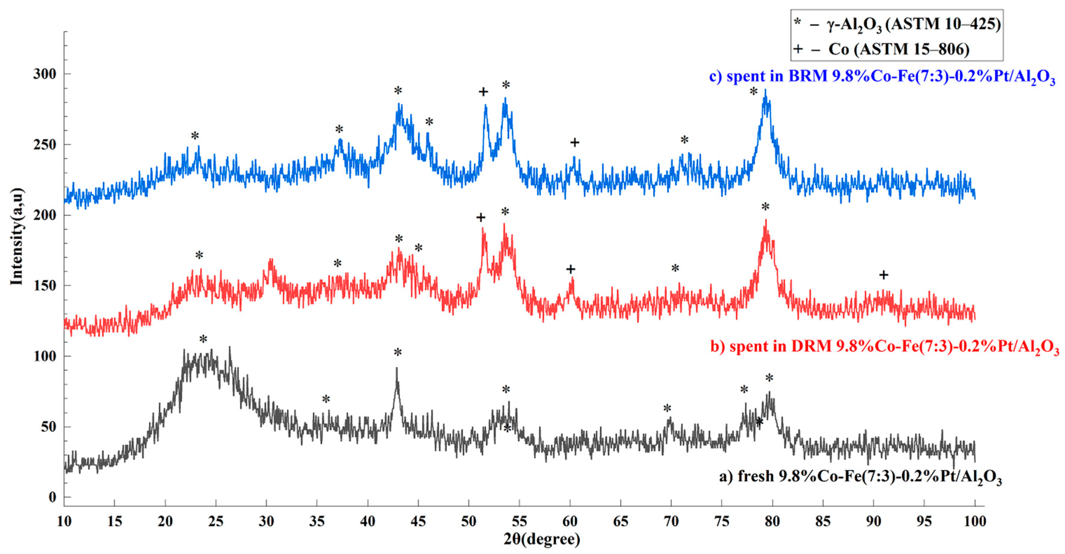 | Co | Fe | Pt | Fresh | Spent in DRM | Spent in BRM | Fresh | Spent in DRM | Spent in BRM | |