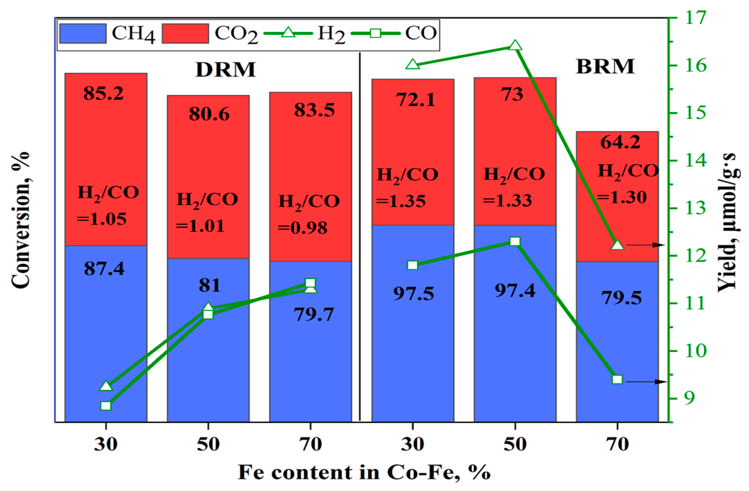 - Iron has been studied less extensively in DRM due to its relatively low catalytic performance. However, iron-based catalysts possess several advantages: they are resistant to coke formation at high temperatures, less expensive than other metals, and operate efficiently across a wide temperature range. In addition, the redox properties of iron compounds can enhance reducibility, further improving overall catalytic efficiency. That is why iron can be considered a promising and economically efficient promoter that positively influences coke resistance.