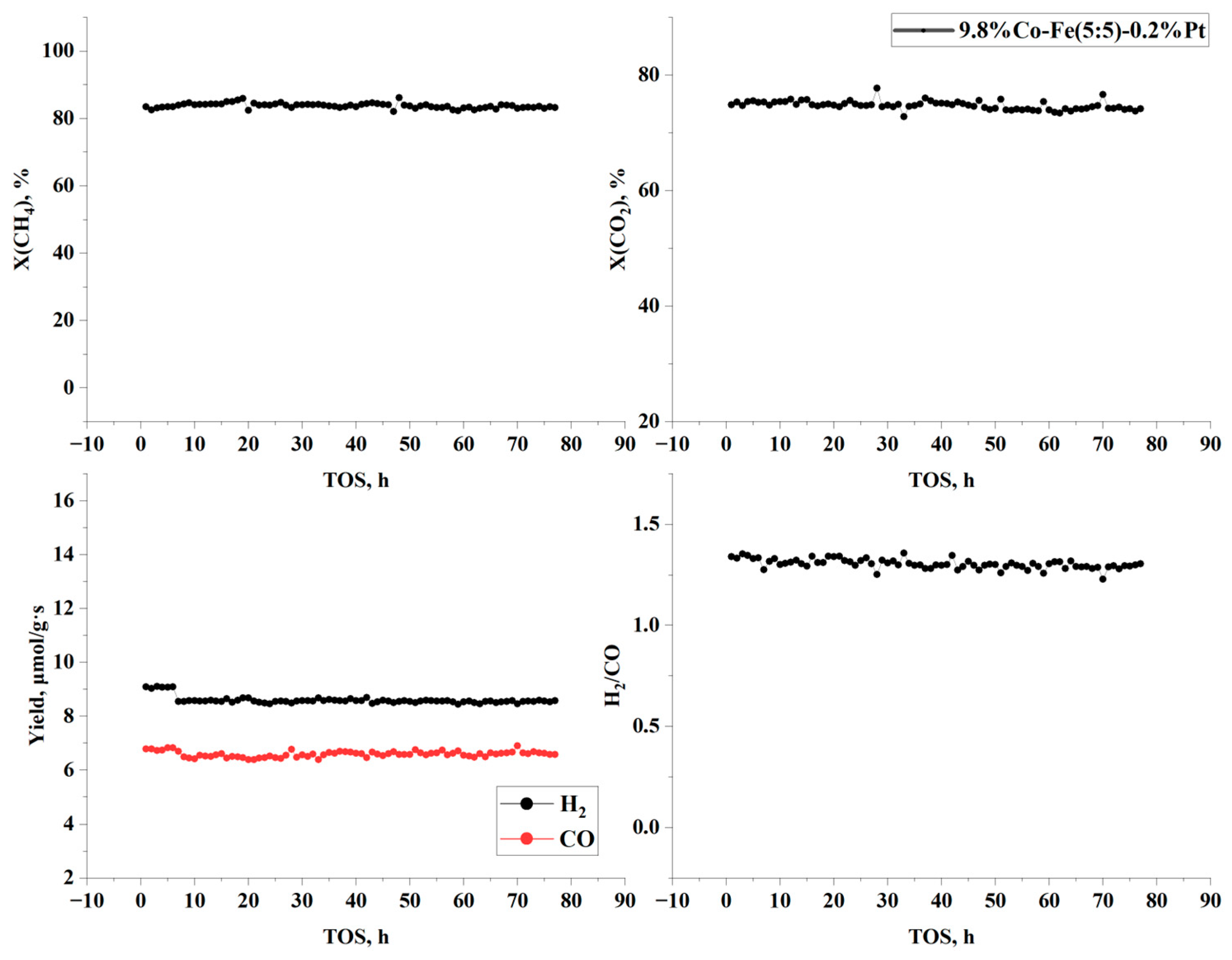 | 0.3Fe-8Co/Al2O3 | 700 °C, PCH4/PCO2 = 20/20 kPa/kPa, GHSV = 36 L gcat−1 h−1 | ~68 | ~94 | ~0.8 | [19] |