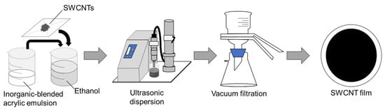 Figure 1 illustrates the fabrication process of the SWCNT-based composite films. The materials and chemicals used in this study included SWCNT powders (ZEONANO SG101, ZEON, Tokyo, Japan), synthesized via the super-growth method [], inorganic-blended acrylic emulsion (Kiwami NB spray, Make3, Osaka, Japan), and ethanol (Fujifilm Wako, Osaka, Japan). During preparation, the materials were mixed in a beaker, with the amount of inorganic-blended acrylic emulsion ranging from 0 to 20 mL, while the amounts of SWCNT powder and ethanol were maintained at 0.1 g and 50 mL, respectively. To prepare a uniform SWCNT composite dispersion, an ultrasonic homogenizer (Branson Sonifier SFX 250, Emerson, St. Louis, MO, USA) was used at 60% amplitude (nominal power of 200 W) for 30 min. The ultrasonic amplitude and frequency were 90 µm and 20 kHz, respectively, with a horn tip diameter of 12.7 mm. The rheology of composite SWCNT inks was examined using a rotational rheometer (MCR102e, Anton Paar, Graz, Austria) with a cone-plate geometry (Ø 50 mm) and a gap size of 0.5 mm, over a shear rate range of 0.1–1000 (1/s). The measurements were conducted at a constant temperature (293 K) controlled by a Peltier system. SWCNT-based composite films were subsequently fabricated via vacuum filtration. The SWCNT composite dispersion was deposited onto a 90 mm PETE membrane filter (ADVANTEC, Tokyo, Japan) positioned in a suction bottle. The filtration was conducted under a suction pressure of 0.08 MPa for approximately 1 h.