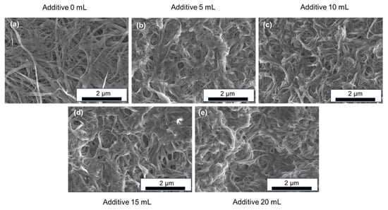 The microstructures of the SWCNT-based composite films containing various amounts of additive, as observed by FE-SEM, are presented in Figure 2. The SEM image of the additive-free SWCNT film is shown in Figure 2a. The SWCNT bundles exhibited a diameter ranging from several tens of nanometers to submicron scales. Considering that the diameter of an individual SWCNT used in this study is approximately 3–5 nm, even the thinnest bundles consisted of multiple nanotubes. The bundles showed no preferential alignment; rather, they appeared curved and entangled, forming voids and gaps within the network. The microstructures of the composite films incorporating 5, 10, 15, and 20 mL of additive are shown in Figure 2b, Figure 2c, Figure 2d, and Figure 2e, respectively. The SWCNT bundles and additives were not phase-separated; rather, the additives adhered to the surfaces of the SWCNT bundles. As the additive content increased, the gaps between the bundles became progressively smaller. Elemental mapping of the SWCNT-based composite films is shown in the Supplementary Materials (Figure S1). The analysis confirmed the presence of carbon originating from both the SWCNTs and the acrylic polymer. Additionally, calcium derived from calcium nitrate was detected and found to be uniformly distributed throughout the films, as further supported by XRD analysis provided in the Supplementary Materials (Figure S2) []. The XRD patterns of the composite films are shown in the Supplementary Materials (Figure S3).