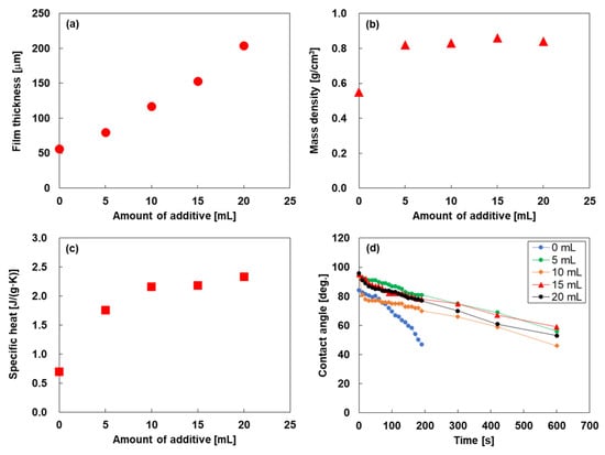 Figure 3 shows the relationship between the amount of additive and the film thickness, mass density, specific heat, and wettability of the SWCNT-based composite films. As shown in Figure 3a, the thickness of the additive-free SWCNT film was 56 μm, and it increased almost linearly with increasing additive content. The composite film containing 20 mL of additive exhibited the maximum thickness of 204 µm. As shown in Figure 3b, the mass density of the additive-free SWCNT film was 0.55 g/cm3. The addition of 5 mL of additive increased the mass density to 0.82 g/cm3, after which it remained nearly constant despite further increases in additive content. As shown in Figure 3c, the specific heat of the additive-free SWCNT film was 0.70 J/(g∙K). The specific heat increased to 2.2 J/(g∙K) when 10 mL of additive was introduced and remained approximately constant with further increases in additive content. The time dependence of the water contact angle for the films is shown in Figure 3d. The initial contact angles of all films ranged between 80° and 100°. However, the contact angle of the additive-free SWCNT film decreased rapidly over time, while those of the composite films decreased more gradually and at nearly constant rates, irrespective of the additive amount. This behavior can be attributed to the higher hydrophobicity of the acrylic polymer compared to that of the SWCNTs.