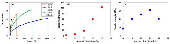 Figure 4 shows the results of the tensile tests of the SWCNT-based composite films. As shown in Figure 4a, the stress–strain curves of the SWCNT-based composite films varied significantly depending on the amount of additive. The additive-free SWCNT film exhibited the lowest breaking strain and tensile strength because the SWCNT bundles were connected only by point contacts through van der Waals forces. In contrast, the films containing additives exhibited greater breaking strain and tensile stress than the additive-free SWCNT film. As the amount of additive increased, the deformation region of the stress–strain curves expanded, and the breaking strain increased. This indicates that films containing larger amounts of additives possessed higher strength and stretchability because the acrylic polymer additives acted as binders. For quantitative analysis, the dependencies of the breaking strain and tensile stress on the amount of additive are shown in Figure 4b and Figure 4c, respectively. The breaking strain increased quadratically with increasing additive content. The SWCNT-based composite film containing 20 mL of additive exhibited a breaking strain of 103%, which was 34 times higher than that of the additive-free SWCNT film. In contrast, the tensile stress increased linearly with the additive amount up to 15 mL, at which point it reached the maximum value of 30.7 MPa, which was 3.5 times higher than that of the additive-free SWCNT film. Upon further increasing the additive amount, the tensile strength decreased to 20.5 MPa. This phenomenon occurred because excessive additives formed pathways that bypassed the SWCNT bundles, leaving only the acrylic polymer. Consequently, the stretchability of the acrylic polymer became the dominant factor.