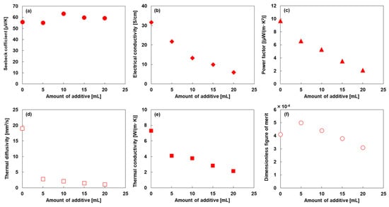 where m*, n, and R represent the effective mass, carrier concentration, and scattering factor, respectively. The Seebeck coefficient is inversely proportional to the two-thirds power of the carrier concentration when the effective mass is fixed. Therefore, it can be concluded that the carrier concentration did not significantly change with increasing additive content. As shown in Figure 5b, the electrical conductivity decreased with increasing additive amount. The electrical conductivity (σ) is expressed by Equation (2): []
