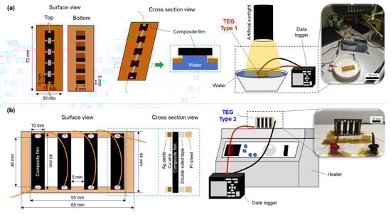 To evaluate the effectiveness of the SWCNT-based composite films, two types of TEGs were fabricated using the composite films, and their performance was measured, as shown in Figure 6. The fabrication process and measurement procedure of the first type of TEG, referred to as the water-floating TEG, are shown in Figure 6a. The detailed fabrication process is described in our previous report []. In brief, the SWCNT-based composite film was cut into five pieces measuring 10 mm in length and 10 mm in width. The substrate was a 70 mm × 30 mm polyimide sheet (Kapton, DuPont, Wilmington, DE, USA) with five rectangular openings (5 mm × 8 mm) arranged in a straight line. The five cut composite films were attached to their respective openings on the polyimide substrate using double-sided tape. This configuration allowed the composite films to come into direct contact with water and generate a temperature difference through evaporative cooling. The five composite films were connected in series using fine copper wires and silver paste, with two additional fine copper wires attached at both ends to measure the output voltage. The water-floating TEGs were irradiated with artificial sunlight at an intensity of approximately 1000 W/m2 (SOLAX 100 W XC-100 B, SERIC, Koshigaya, Japan), while the water temperature was maintained at 35 °C. The output voltages and temperatures of the water-floating TEGs were recorded for 30 min after light exposure using a data logger (GL240, GRAPHTEC, Yokohama, Japan). Figure 6b shows the fabrication process and measurement procedure of the second type of TEG, namely, the standard TEGs vertically mounted on a heater. The SWCNT-based composite film was cut into four 40 mm × 10 mm pieces. The substrate was a 65 mm × 44 mm polyimide sheet (Kapton, DuPont, Wilmington, DE, USA) with a 55 mm × 36 mm rectangular opening to minimize contact with the composite films. The composite films were spaced 5 mm apart and attached to the substrate using double-sided tape at both ends. The four composite films were connected with thin copper wires and silver paste along the top and bottom edges of adjacent films. Two additional thin copper wires were attached to each end of the films to measure the output voltage. The TEG was positioned perpendicular to the heater (DP-1L, AsOne, Osaka, Japan) to establish a temperature difference between the top and bottom surfaces of the composite films. The heater temperature was maintained at 60 °C, and the output voltage was recorded for 15 min using a data logger (GL240, GRAPHTEC, Yokohama, Japan).