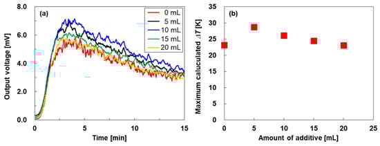 (a) Time dependence of output voltage of standard TEGs vertically mounted on a heater with various additive amounts, and (b) calculated temperature difference in TEGs as a function of additive amount.