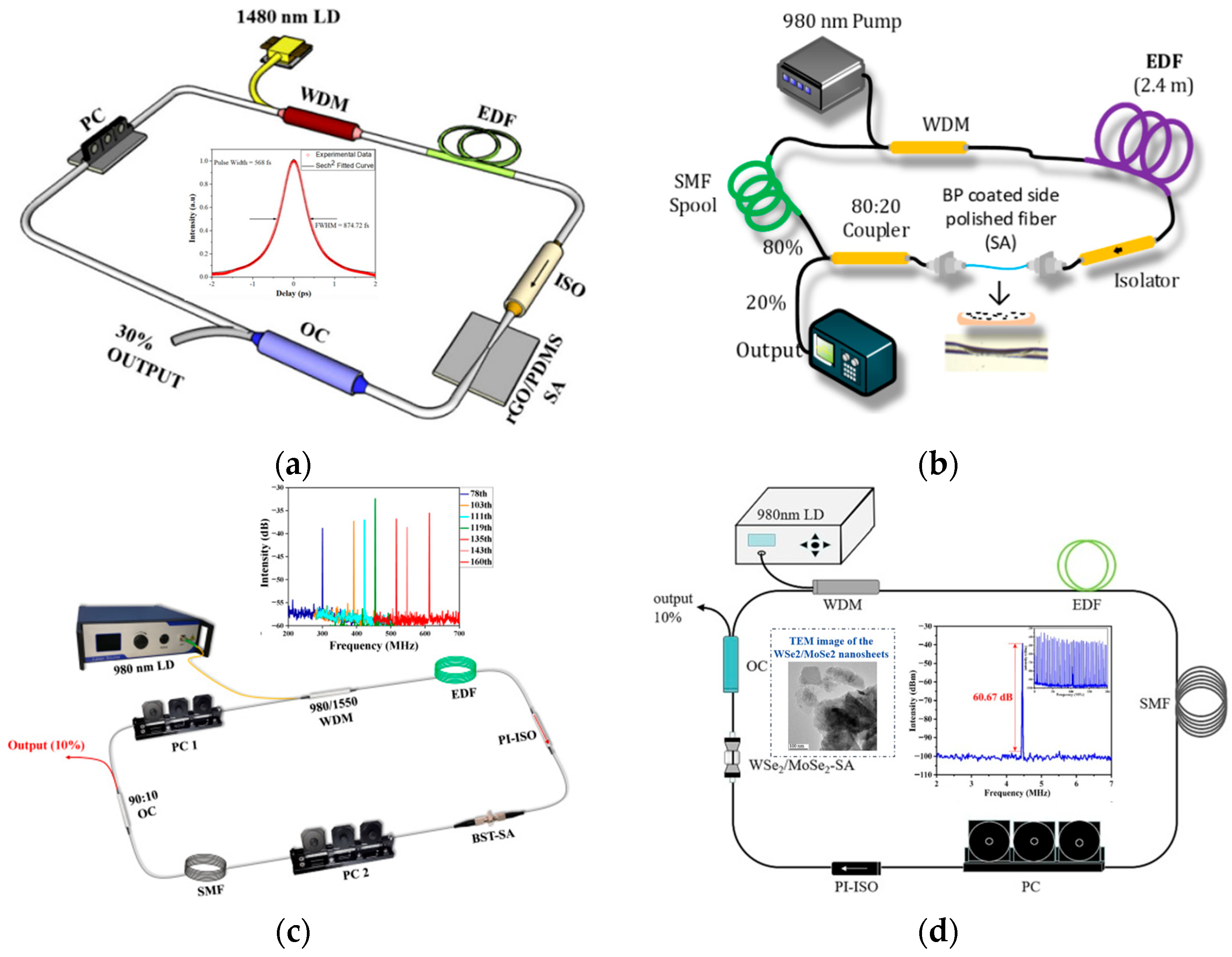 - Lau, K.Y.; Abidin, N.H.Z.; Abu Bakar, M.H.; A Latif, A.; Muhammad, F.D.; Huang, N.M.; Omar, M.F.; A Mahdi, M. Passively mode-locked ultrashort pulse fiber laser incorporating multi-layered graphene nanoplatelets saturable absorber. J. Phys. Commun. 2018, 2, 075005. [Google Scholar] [CrossRef]
