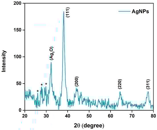 The crystalline nature of the synthesized AgNPs was examined using XRD over a 2θ range of 20°–80°, and the resulting diffraction pattern is presented in Figure 2. Four prominent diffraction peaks appeared at 2θ values of 38.18°, 44.20°, 64.43°, and 77.40°, corresponding to the (111), (200), (220), and (311) crystallographic planes of fcc Ag, respectively. These reflections confirmed the crystalline and fcc nature of the AgNPs, in agreement with the JCPDS standard powder diffraction card (silver file No. 04-0783) [,,,]. A peak at 2θ = 32.34° was also detected, which may be attributed to unreduced AgNO3 or the possible formation of silver oxide (Ag2O) due to partial surface oxidation of the AgNPs during sample preparation. In addition, several low-intensity peaks marked with an asterisk below 2θ = 30° were observed, likely originating from crystalline phytochemical constituents of the Celtis africana extract. These signals suggest the presence of bio-organic residues capping or interacting with the surfaces of the AgNPs [,]. Overall, the XRD analysis confirmed the successful formation of crystalline AgNPs and indicated a possible contribution of plant-derived biomolecules to their structural characteristics and stability.