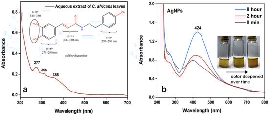 (a) UV–Visible spectrum of the aqueous extract of Celtis africana leaves; (b) UV–Visible spectra of AgNPs recorded at different time intervals.