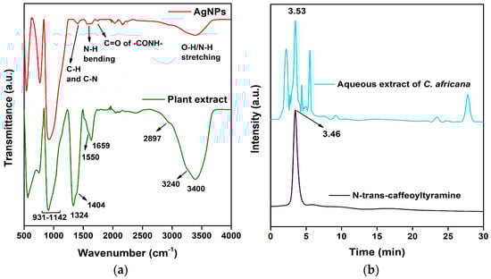 (a) FTIR spectra of the aqueous extract of Celtis africana leaves and synthesized AgNPs; (b) HPLC chromatogram of the extract showing phenolic amide-like compounds.