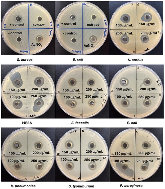 The antibacterial activity of Celtis africana extract-mediated AgNPs was assessed against both Gram-positive bacteria (S. aureus, MRSA, and E. faecalis) and Gram-negative bacteria (E. coli, K. pneumoniae, S. typhimurium, and P. aeruginosa) using the agar well diffusion method [,]. All bacterial strains were obtained from the King Fahad Medical Research Center (KFMRC), Jeddah, Saudi Arabia. Fresh bacterial suspensions were prepared according to standard microbiological protocols and adjusted to a 0.5 McFarland turbidity standard. For the assay, 0.1 mL of each bacterial suspension was evenly spread on nutrient agar plates, after which 6 mm wells were punched using a sterile cork borer. Each well was then filled with 100 µL of AgNPs (215.7 µg/mL). The plates were then incubated at 37 °C for 24 h, and the antibacterial activity was assessed by measuring the diameter of the inhibition zones. Tetracycline (40 µg/mL) was used as a positive control, while sterile distilled water served as a negative control.