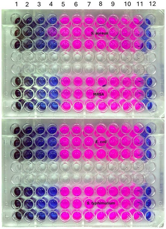 The minimum inhibitory concentration (MIC) of the synthesized AgNPs was determined using the broth microdilution method in 96-well microtiter plates [,]. Fresh bacterial cultures of S. aureus, MRSA, E. coli, and S. typhimurium, representing both Gram-positive and Gram-negative bacteria, were prepared and adjusted to match the turbidity of a 0.5 McFarland standard. Each 96-well plate consisted of 12 columns. AgNPs were serially diluted across columns 1 to 10 using a two-fold dilution method to achieve final concentrations of 100, 50, 25, 12.5, 6.25, 3.12, 1.56, 0.78, 0.39, and 0.195 µg/mL, respectively. Each well was then inoculated with 100 µL of the respective bacterial suspension. Column 11 served as the positive control (bacterial culture without AgNPs), while column 12 was used as the negative control (nutrient broth only). In total, four plates were prepared, one for each bacterial strain. The plates were incubated at 37 °C for 22 h. After incubation, 20 µL of 0.2% (w/v) resazurin solution was added to each well as an indicator of bacterial viability. The plates were then incubated for an additional 4 h at 37 °C. The MIC was defined as the lowest concentration of AgNPs that inhibited visible bacterial growth, indicated by the retention of the blue color of the resazurin dye (no color change).