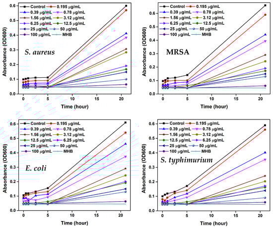 Growth curves analysis for S. aureus, MRSA, E. coli, and S. typhimurium treated with various concentrations of AgNPs over time.