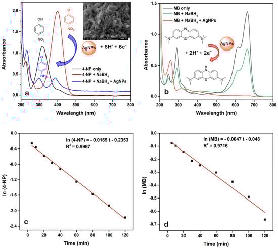 UV–Visible spectra of 4-NP (a) and MB (b) reduction by AgNPs and NaBH4, and corresponding concentrations change over time (c,d).