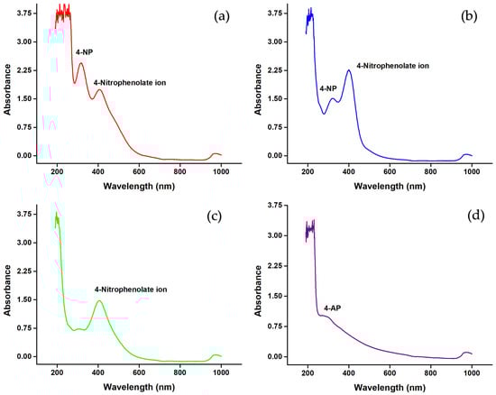 UV–Visible spectra showing (a) 4-NP after spiking 20 µg/mL, (b) after addition of AgNPs and NaBH4, (c) complete conversion of 4-NP into 4-nitrophenolate ions, and (d) reduction of 4-nitrophenolate ions into 4-AP.
