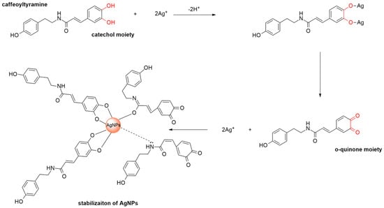 The mechanism underlying the phytogenic synthesis of AgNPs using the aqueous extract of Celtis africana leaves was elucidated based on phytochemical evidence and spectroscopic analysis. Celtis africana is known to be particularly rich in phenolic amides, especially bearing catechol moieties such as caffeoyltyramine. UV–Visible, FTIR, and HPLC analysis all support the involvement of these catechol-bearing compounds in the reduction of Ag+ ions to metallic Ag0, likely providing greater reducing capacity than their monophenolic analogs. A plausible reduction mechanism is illustrated in Scheme 2. Initially, the two hydroxyl groups of the catechol moiety undergo deprotonation, facilitating the formation of a coordination complex with Ag+ ions. This interaction promotes electron transfer, reducing Ag+ to metallic Ag0 while concurrently oxidizing the catechol to o-quinone. The resulting o-quinone species, along with preserved amide functionalities, adsorb onto the surface of the AgNPs via electrostatic interactions and hydrogen bonding []. These interactions contribute to the stabilization of the AgNPs, as indicated by a zeta potential of −22.2 ± 0.8 mV, and promote their uniform dispersion in the colloidal medium []. This dual functionality, reduction by catechol and capping through both the oxidized o-quinone and amide groups, highlights the key role of catechol-bearing phenolic amides in both the nucleation and stabilization phases of AgNPs formation.