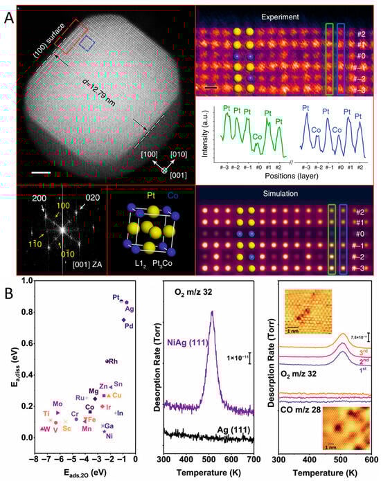 (A) In situ STEM results from a Pt3Co NP after oxygen annealing at 993 K [64]. (B) DFT calculations of the O2 dissociation barrier Ea,diss as a function of the adsorption energy of the resulting dissociated O atoms (Eads,2O) for various single-atom dopants in Ag(111) and O2 TPD traces, as well as sequential TPD traces (insets show STM images of samples) [45].