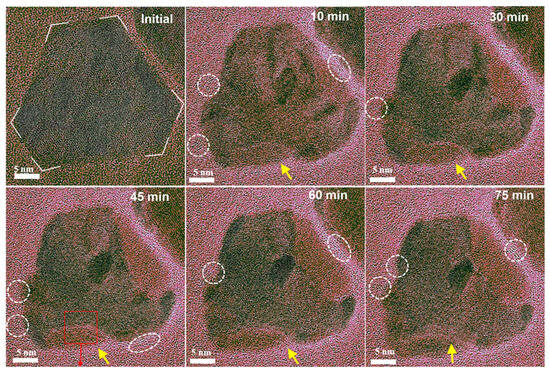 High-temperature treatment can cause the diffusions between heterogeneous atoms in alloys and thus result in variation in partial composition in alloys. Combined with in situ STEM and energy dispersive X-ray spectroscopy (EDX), Mirsaidov et al. observed the phase separation of AuRu alloy nanoparticles during heating increased from 623 K to 1023 K [78]. At the initial stage of phase separation, metastable phase decomposition of the alloy leads to the formation of small face-centered cubic (fcc) Ru clusters. When the temperature is increased, as the fcc Ru clusters grow larger, they undergo a phase transition to the more stable hexagonal close-packed (hcp) Ru structure. This transformation is attributed to the size-dependent competition between the interfacial and bulk energies of Ru domains. Under heating conditions of 973 K, the atomic diffusion of Au and Ru produced four Ru-rich domains. This finding showed that fcc AuRu alloy nanoparticles (containing about 85% Au and 15% Ru) will undergo phase separation, forming an fcc Ru intermediate phase from the fcc AuRu alloy, and finally forming a Ru phase with an hcp crystal structure.