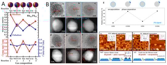 (A) The gas-dependent surface segregation of Rh-Pd nanoparticles [52]. (B) In situ TEM and STM characterizations of surface segregation of PdFe alloys under CO or O2 atmospheres [86].