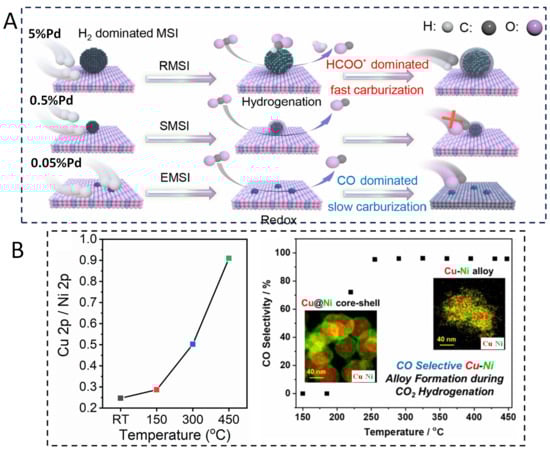 (A) The schematic diagram of size-dependent domino effect on Pd/FeOx catalysts during CO2 hydrogenation reaction [107]. In this case, RMSIs are evidenced by the structural transformation of the 5%Pd/FeOx catalyst from Pd to a Pd3Fe alloy under reaction conditions. SMSIs are indicated by the formation of a Pd@FeOx core–shell structure. EMSIs are defined by the electron transfer between Pd single atoms and the FeOx support. * represents absorbate. (B) Structure–activity relationship of Cu-Ni catalyst during CO2 hydrogenation reaction [108].