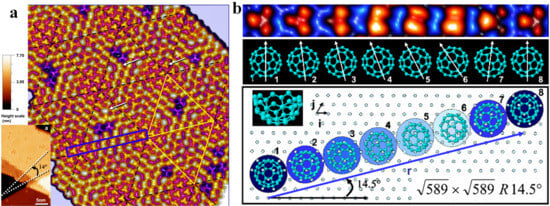 Breakthroughs in NAP-STM have driven substantial advances in catalysis research in recent years [118,119], such as alloy surface segregation phenomenon, distribution of active sites in single-atom catalysts, identification of oxide defect sites and adsorption/desorption dynamics of catalytic reactants [51,120,121,122]. With high resolution and in situ characterization capabilities, STM provides fundamental insights into surface structure and active sites of catalysts, and reaction mechanisms at the molecular level. Berndt et al. studied the adsorption of C60 on Au(111), finding that 49 of C60 molecules formed a Si(111)-7 × 7-like structure, as shown in Figure 13 [123]. They proposed a model that substrate-induced moiré-effect-like weeny orientation changes of C60 molecules allow the √589 × √589 R14.5° superlattice to offer epitaxial sites. These sites optimize intermolecular interactions, which is key for the superlattice’s stability.