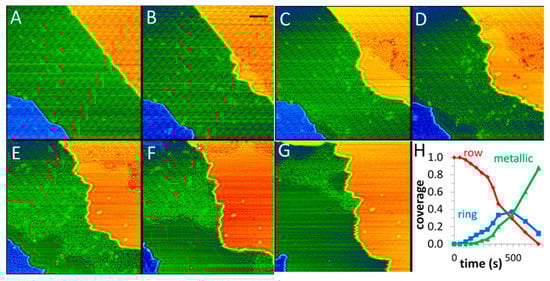 (A–G) STM snapshots during the reduction in a Cu2O film under 10 mTorr CO at 300 K after 46, 281, 374, 490, 603, 715, and 828 s. (H) Phase coverages are plotted as a function of CO exposure [50]. The color in the images corresponds to height contrast; U = 1.1 V, and I = 0.83 nA; scale bar = 5 nm.