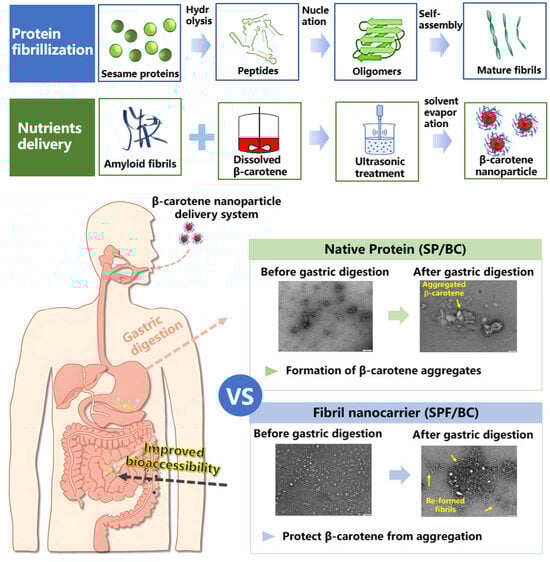 Zhang, L.; Zhang, P.; Tong, H.; Zhao, Y.; Yu, T.; Liu, G.; Liu, D. The Reconstruction of Sesame Protein-Derived Amyloid Fibrils Alleviates the Gastric Digestion Instability of β-Carotene Nanoparticles. Nanomaterials 2025, 15, 1829. https://doi.org/10.3390/nano15231829