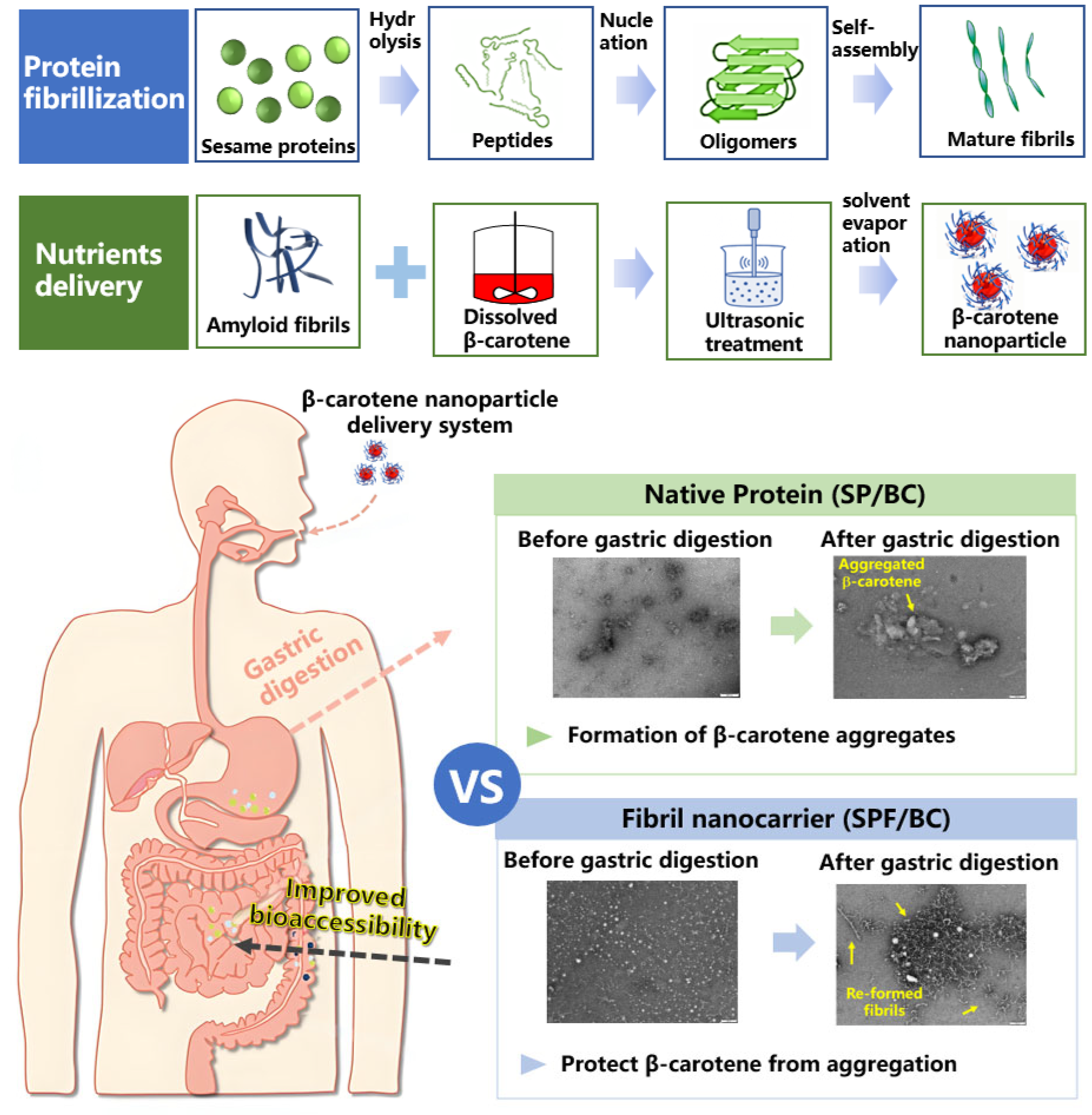 However, several limitations of this study should be acknowledged. Firstly, the digestion experiments were conducted under in vitro simulated gastrointestinal conditions, which could not fully recapitulate the highly dynamic physiological environment of the human gastrointestinal tract (including peristalsis, mucosal interactions and complex enzymatic regulation). Secondly, this study specifically examined regenerated fibrils derived from sesame protein and β-carotene as a model hydrophobic nutrient; therefore, the generalizability of the delivery performance to other proteins or bioactive compounds remains uncertain. Furthermore, the cytotoxicity, immunogenicity and in vivo metabolic consequences of the regenerated fibrils were not evaluated. Future studies should incorporate in vivo validation and bioactivity models to fully assess the applicability and biosafety of fibril-based delivery systems.