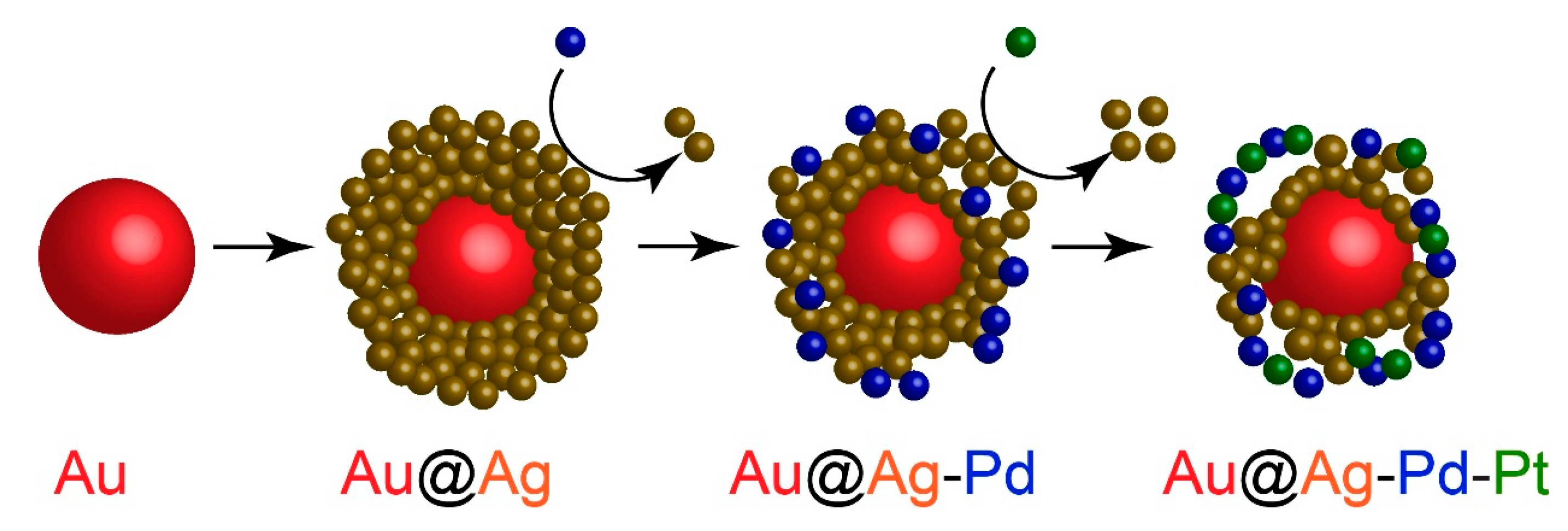 - Liu, X.; Astruc, D. From Galvanic to Anti-Galvanic Synthesis of Bimetallic Nanoparticles and Applications in Catalysis, Sensing, and Materials Science. Adv. Mater. 2017, 29, 1605305. [Google Scholar] [CrossRef] [PubMed]
