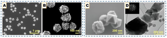 Morphological signatures of NDs’ formation under distinct CVD regimes. (A,B) Gas-phase nucleation through pinhole-assisted collection, confirming particle condensation independent of the substrate. Reproduced from Ref. [84]. (C,D) Seeded-film growth on Si(100) demonstrating selective seed survival and crystalline faceting; inset diffraction pattern confirms sp3 order. Reproduced from Ref. [88]. Copyright 2019 WILEY-VCH Verlag GmbH & Co. KGaA, Weinheim.
