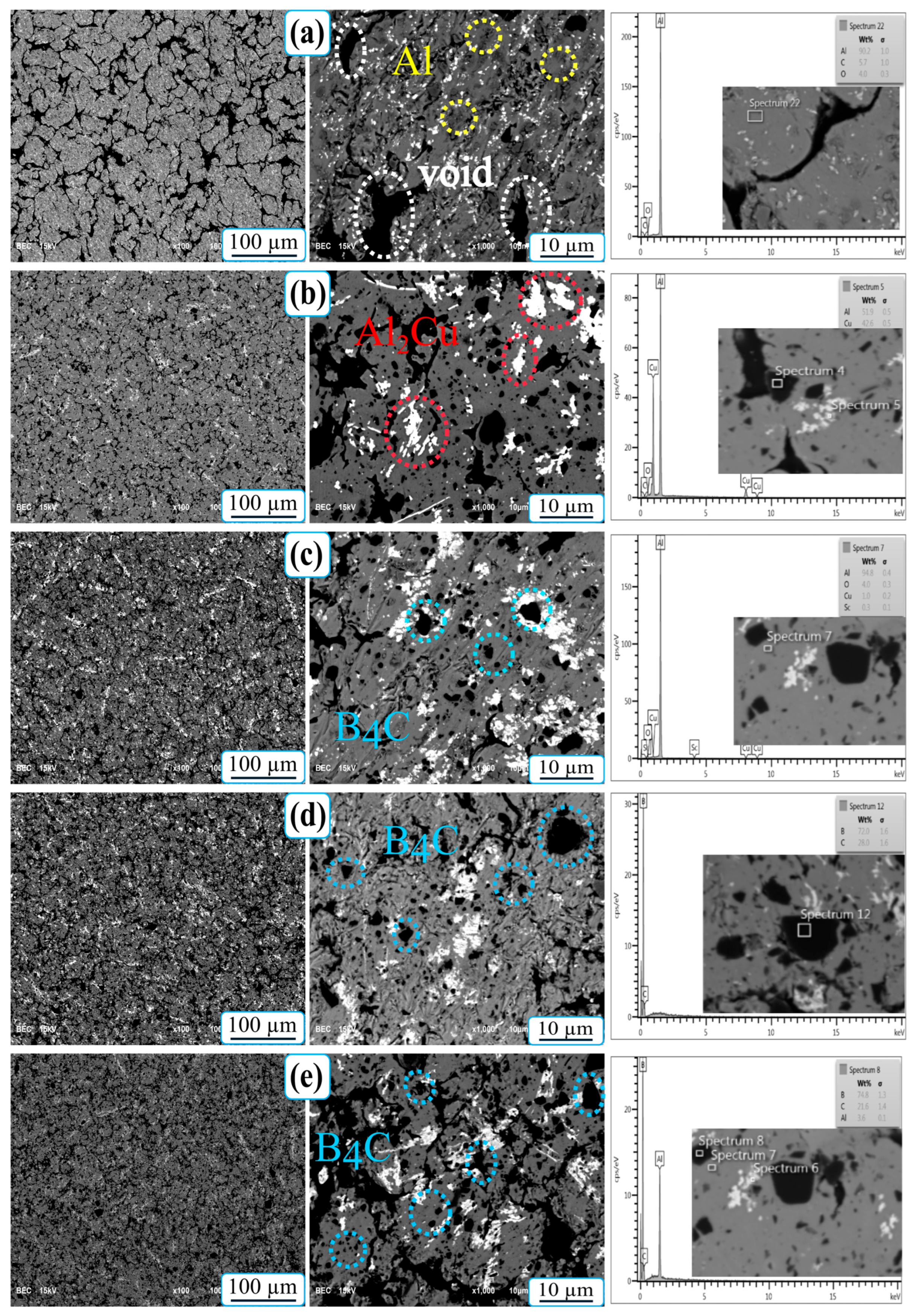 4C inherently promotes interfacial porosity due to the limited wettability between Al and the rigid ceramic particles. During pressing and sintering, the restricted flow of the Al matrix around angular B