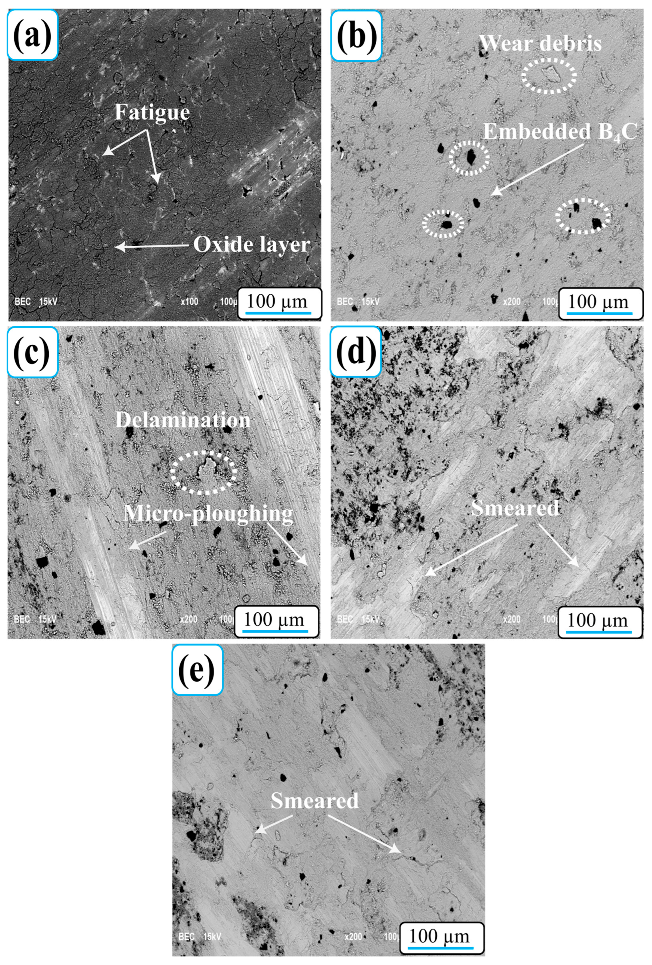 Figure 5). Overall, the wear mechanism evolves from adhesive–oxidative delamination in the unmodified alloy to abrasive wear in highly reinforced nanocomposites. The inclusion of B