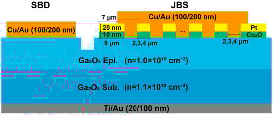 Cross-sectional schematic image of the β-Ga2O3 SBD and JBS diodes with Cu anode.