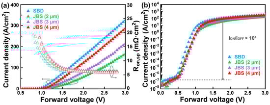 Figure 3b depicts the semi-logarithmic I–V characteristics of the β-Ga2O3 JBS diodes and SBD. For a fair comparison, the current density of the SBD and JBS diodes was calculated by normalized the measure current to the full anode area. All diodes exhibit excellent rectifying behavior, with ION/IOFF ratios exceeding 109, confirming the effective suppression of reverse leakage current and the strong rectification capability of the heterojunction structures. The VON, defined at current density of 1 A/cm2, was extracted to be 0.68 V for the SBD and 0.79 V, 0.78 V, and 0.78 V for the JBS diodes with Cu2O spacings of 2, 3, and 4 μm, respectively. The slightly delayed turn-on behavior observed in the JBS diodes compared with the SBD originates from the additional potential barrier introduced by the p–n heterojunctions. This delayed conduction is an intrinsic feature of JBS structures, where the p–n heterojunction regions are designed to block leakage under reverse bias while the Schottky regions dominate forward conduction [31,32].