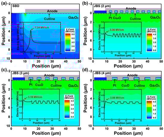 To further elucidate the influence of Cu2O spacing on the breakdown performance, electric field simulations were conducted on these devices under a reverse voltage of 1000 V. Figure 5 compares the electric field distributions of the β-Ga2O3 SBD and the JBS diodes with Cu2O spacings of 2, 3, and 4 μm, respectively. As shown in Figure 5a, the SBD exhibits pronounced field crowding at the Schottky edge, where the peak electric field reaches 7.34 MV/cm, indicating that the breakdown is dominated by anode edge localization [34]. In contrast, the β-Ga2O3 JBS diodes demonstrate significantly suppressed electric fields of 3.36 MV/cm, 3.19 MV/cm and 3.06 MV/cm for Cu2O spacings of 2, 3, and 4 μm, respectively, accompanied by a smoother and more uniformly distributed field profile along the cutline. The periodic p-type Cu2O regions redistributes the reverse-bias space charge, creating multiple depletion junctions that spread the electric field within the β-Ga2O3 drift layer [35,36]. This effect effectively mitigates edge crowding and yields a more uniform field profile. Consequently, the JBS diodes with Cu2O spacings substantially improves electric field modulation, consistent with the experimentally observed enhancement in breakdown capability.
