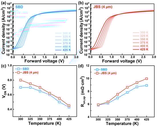 Temperature-dependent I–V characteristics of β-Ga2O3 (a) SBD and (b) JBS diode. (c,d) are the extracted VON and Ron,sp parameters of the β-Ga2O3 JBS diode and SBD.