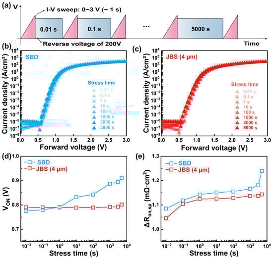 (a) Measurement-stress-measurement scheme for long-term reliability test. Linear-scale forward I–V characteristics of the β-Ga2O3 (b) SBD and (c) JBS diode after various stress times. (d,e) are the extracted corresponding VON and ∆Ron,sp as a function of the stress time, respectively.