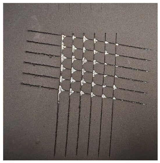 Adhesion testing, performed according to ASTM D3359, revealed localized delamination at the cut intersections. As shown in Figure 7, the detached area was less than 15%, which corresponds to a rating of 3A on the standard classification scale, indicating good adhesion.