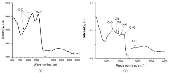 The FT-IR spectrum of the pristine few-layer graphene (Figure 8a) exhibits two broad bands: one at 1224 cm−1, assigned to C–O stretching vibrations, and another at 1558 cm−1, attributed to C=C aromatic ring vibrations [36]. The significant broadening of these bands is likely due to the presence of a wide variety of alcohol and ether groups formed during the uncontrolled SHS process. In contrast, the spectrum of the cross-linked FLG-based coating (Figure 8b) displays several distinct vibrational bands corresponding to the newly formed chemical bonds. These include: C–O–C stretching at 1237 cm−1, C–N stretching in the urethane group at 1350 cm−1, C–H bending at 1430 cm−1, symmetric and asymmetric C–H stretching at 2865 cm−1 and 2931 cm−1, respectively, and N–H bending and C=O stretching (amide I) of the urethane group at 1530 cm−1 and 1650 cm−1 [37]. The emergence of these bands confirms the successful chemical cross-linking of the FLG particles. Notably, the intensities of the N–H and C=O bands are relatively weak, which can be attributed to their partial overlap with the broad C=C absorption band from the underlying graphene structure.