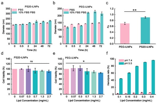 The time-dependent stability of PS20-iLNPs and PEG-iLNPs was assessed in the presence or absence of serum. PS20-iLNPs and PEG-iLNPs were added to PBS and PBS with 10% FBS (FBS-PBS), respectively. The iLNPs were diluted with PBS or FBS-PBS at a volume ratio of 1:9 (total lipid 2.5 mg/mL). The iLNPs were incubated at 37 °C for 0.5, 2, 24, 48, and 72 h, then measured by dynamic light scattering (DLS, Zetasizer Nano ZEN5600, Malvern, UK) to monitor the changes in hydrodynamic size, polydispersity index (PDI), and zeta-potential of the iLNPs.