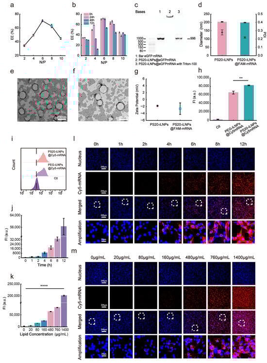 Ionizable lipid-mRNA lipid nanoparticles are formed through electrostatic interactions between the ionizable amine groups of lipid-like polyamines and the phosphate groups of mRNA molecules. The N/P ratio, defined as the molar ratio of nitrogen (in the amine head-groups of lipopolyamines) to phosphorus (in the oligonucleotide backbones), is a critical parameter for evaluating nucleic acid delivery efficiency using lipid nanoparticle [48]. This study aimed to determine the optimal N/P ratio for encapsulating Cy5-labeled mRNA in PS20-iLNPs (PS20-iLNPs@Cy5mRNA). As shown in Figure 3a, the highest encapsulation efficiency (EE%) of 70.2% was at N/P ratio of 6. The PS20-iLNPs@Cy5mRNA at varying N/P ratios were stored at 4 °C for 72 h, the encapsulation efficiency of iLNPs decreased in all groups except for N/P ratio of 6 group (Figure 3b and Figure S6), which indicated that the interactions between the phospholipids and the nucleic acids were the most stable at N/P of 6, ensuring the structural stability of the PS20-iLNPs@Cy5mRNA. Agarose gel electrophoresis analysis demonstrated that eGFP mRNA was effectively encapsulated within PS20-iLNPs@eGFP mRNA, with maintained mRNA integrity (Figure 3c). Further physical characterization revealed that PS20-iLNPs@Cy5mRNA had an average diameter of 199.3 nm. Electrostatically driven interaction between negatively charged mRNA and protonated SM-102 resulted in slightly reduced particle size of PS20-iLNPs@Cy5mRNA than that of bare PS20-iLNPs (Figure 3d). The morphological features of PS20-iLNPs@eGFP mRNA and PEG-iLNPs@eGFP mRNA were visualized using transmission electron microscopy (TEM), demonstrating nanoparticles with near-spherical topography and well-defined peripheral boundaries. (Figure 3e,f). Under physiological pH, both loaded and bare PS20-iLNPs exhibited near-neutral zeta-potentials (−2.4467 mV), demonstrating that the mRNA was successfully encapsulated in iLNPs (Figure 3g).