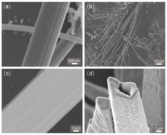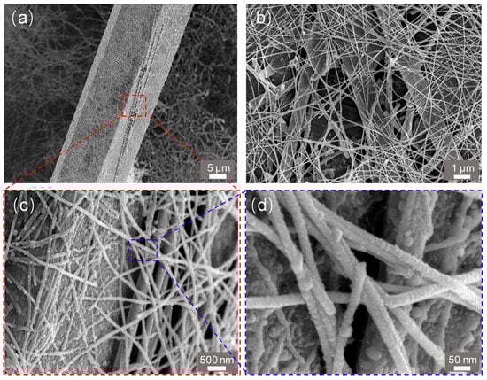 SEM images of the Sb2Se3-MW/Se-MT/Ag-NW with different scale bars: (a) 5 μm, (b) 1 μm, (c) 500 nm, and (d) 50 nm.