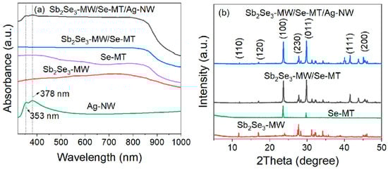 UV–vis absorption spectra of the Ag-NW, Sb2Se3-MW, Se-MT, Sb2Se3-MW/Se-MT, and Sb2Se3-MW/Se-MT/Ag-NW (a) and XRD patterns of the Sb2Se3-MW, Se-MT, Sb2Se3-MW/Se-MT, and Sb2Se3-MW/Se-MT/Ag-NW (b).