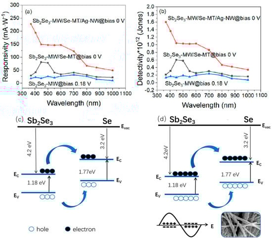 Responsivity curves (a) and specific detectivity curves (b) of the Sb2Se3-MW/Se-MT/Ag-NW and the Sb2Se3-MW/Se-MT devices at 0 V bias. The schematic diagrams of the energy band of the Sb2Se3-MW/Se-MT (c) and the Sb2Se3-MW/Se-MT/Ag-NW (d) devices.
