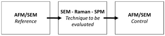 The first thing was to determine what kind of degradation could be observed using the different techniques employed in this study, i.e., SEM, Raman, SThM, and SMM. The last two will be evaluated together and identified as “SPM techniques in contact mode”. A diagram of the methodology used is presented in Figure 4.