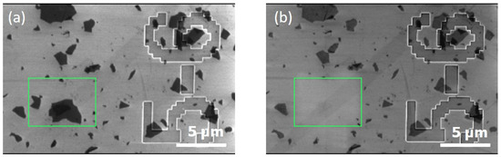 (a) SEM reference image of the ROI before and (b) after laser irradiation during Raman analysis of GO deposited on SiO2/Si substrate. The green boxes indicate the location of the ROI.