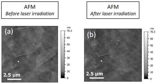 Figure 7a indicates that before irradiation, GO flakes were clearly observable within the ROI. After laser irradiation (Figure 7b), an AFM image was acquired from exactly the same ROI. The GO flakes on the left at the bottom almost disappeared. The flakes in the neighborhood of the ROI were still present, showing that only the targeted flake or those in a close neighborhood were affected by the laser.
