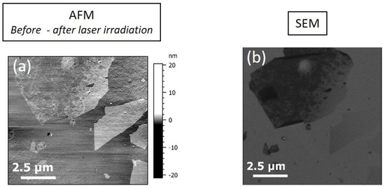In order to go further in the analysis of the generated data, the AFM image before the irradiation was subtracted from the AFM image after irradiation. This operation facilitates the visualization of the boundaries of flakes, which is difficult to discern by AFM due to the roughness of the substrate, and highlights damage to the flakes. An SEM image was also acquired, as seen in Figure 8.
