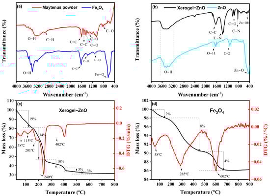 (a) FTIR spectra of Maytenus rigida powder and as-synthesized Fe3O4 nanoparticles. (b) FTIR spectra of xerogel precursor and ZnO nanoparticles, evidencing the disappearance of organic vibrations and emergence of the Zn–O stretching band upon crystallization. (c) TGA/DTG profiles of the xerogel precursor of ZnO nanoparticles. (d) TGA/DTG profiles of as-synthesized Fe3O4 nanoparticles.