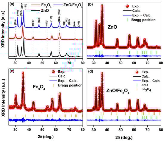 (a) Stacked powder XRD patterns of wurtzite ZnO (calcined at 400 °C), as-synthesized spinel Fe3O4, and the ZnO/Fe3O4 nanocomposite. (b–d) Rietveld refinements (red symbols, observed; black line, calculated; blue line, difference) with vertical ticks marking Bragg positions. The asterisk (*) indicates the reflection assigned to Fe3O4 spinel phase.